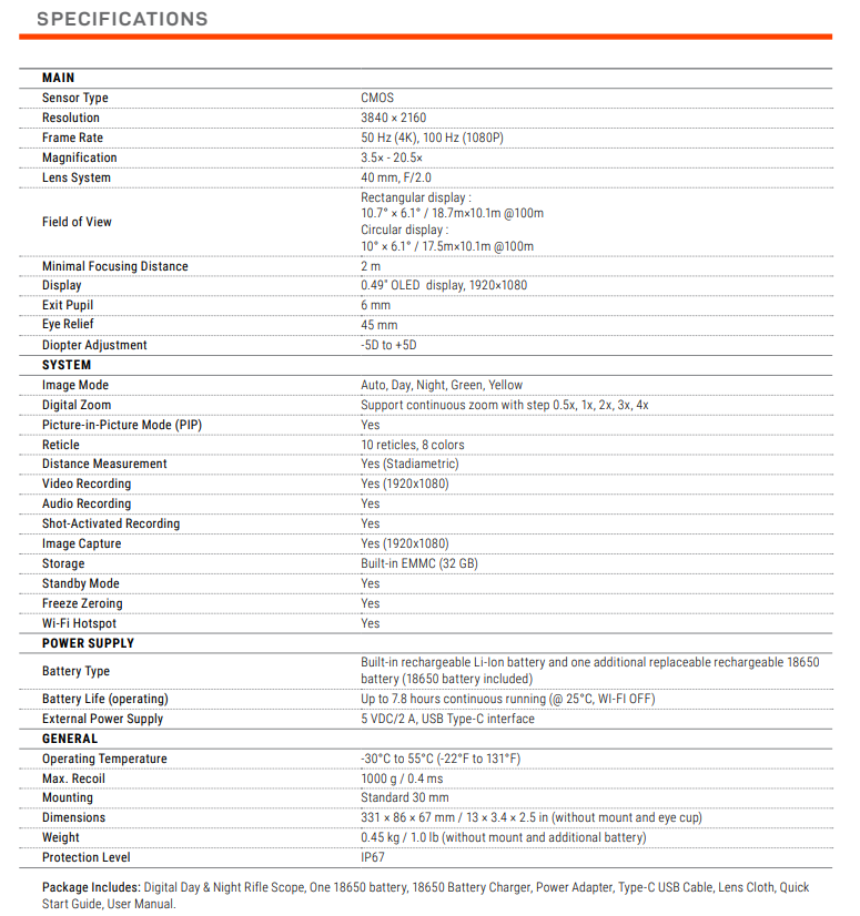 The NEW Spectrum 4K-Mini digital day & night vision scope from AGM utilizes practically all features (except the laser rangefinder) that shooters have come to know and love in the Spectrum LRF 4K, but in smaller and lighter body. Spectrum 4K-Mini based on an advanced high-resolution 3840×2160 detector, which works in conjunction with a high quality 1920x1080 OLED display. This new display allows users the ability to switch from a semi-circular interface to a rectangular interface. Also added the ability to switch the image refresh rate to 100 Hz, that enhances image fluidity, particularly useful for fast-moving targets. The Spectrum 4K-Mini is one step in the continuous evolution of full color digital electro-optics. New and improved 4K digital sensors are now naturally more sensitive to infrared than older models once were, which means the unit should require much less external Infrared light while used in night mode. The Spectrum is literally built for prime, legal daytime hunting hours in the precious minutes just after sunrise and just prior to sunset. Powered by built-in rechargeable battery and one additional replaceable 18650 batteries. The 8hr battery life supplies users with more than enough time behind the eyepiece during hunting season. The internal storage capacity, which comes in at a robust 32GB, which will come in handy when recording in high resolution. If you’re looking for an exceptionally capable technological optic, the Spectrum 4K-Mini is the perfect addition to your arsenal.