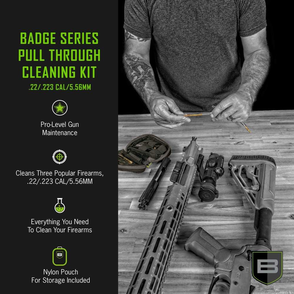 - BADGE SERIES CLEANING KIT: Provided in the pack is (1) Nylon Pouch with Molle, (1) Polymer T-Handle, (1) Double-Ended Nylon Brush, (1) 33" Nylon Coated Steel Cable (male/female), (1) Green Chamber Flag, (1) .22 Cal. Brass Patch Holder, (1) .22 Cal. Phosphor Bronze Bore Brush, (1) 12mL of All-In-One, and (10) 1-Inch Square Cotton Patches, providing everything you need to ensure thorough maintenance of your 5.56mm chambered firearm.