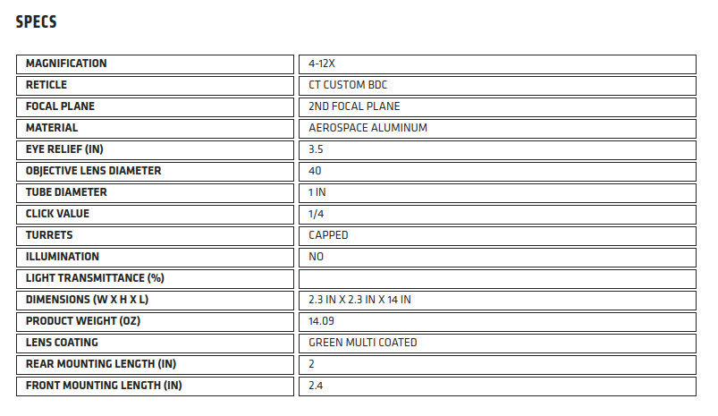 The Crimson Trace Brushline 4-12x40mm scope with Crimson Trace's custom BDC Reticle is the classic higher-power hunting scope with a modernized BDC reticle. The diamond shapes in the reticle allow for three distinct aiming points per diamond. This scope boasts a 1" tube made of aerospace-grade aluminum, making it lightweight yet durable. It has passed extensive environmental testing and is nitrogen-purged, waterproof, shockproof. It boasts MOC-coated ELD glass, and the aggressive knurling on the magnification ring and turret ensures effortless adjustments. All Crimson Trace® scopes are covered under a Lifetime Warranty and is backed by our award-winning customer service team.