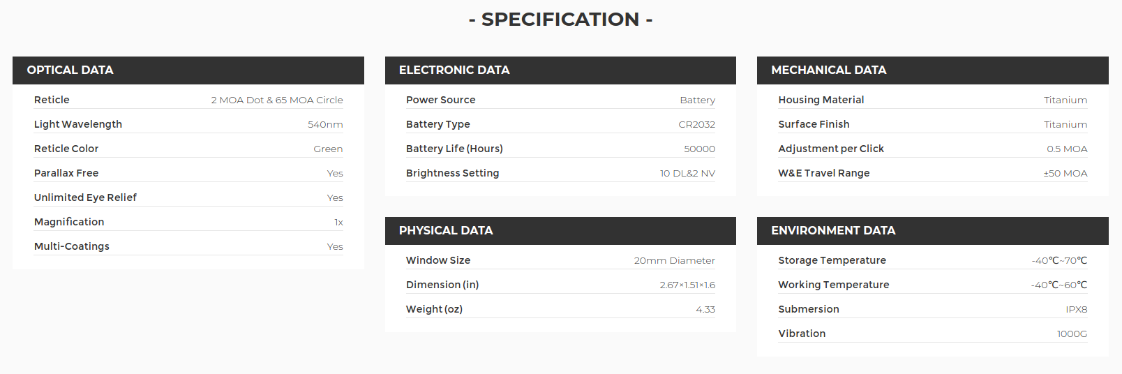The HE515GT-GR is a 20mm micro optical sight designed for rifle and carbine applications. Features include a Titanium Housing, Shake Awake, 12 brightness settings, Holosun’s Green Super LED with up to 50k hour battery life, Multi-Reticle System, QD mount, Kill flash, and Clear Lens Caps.