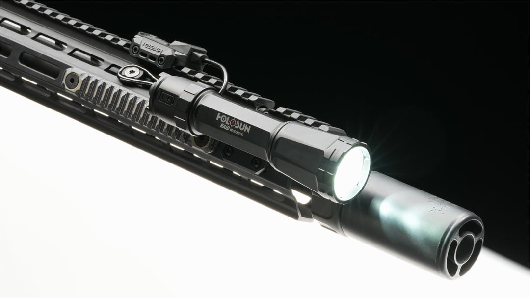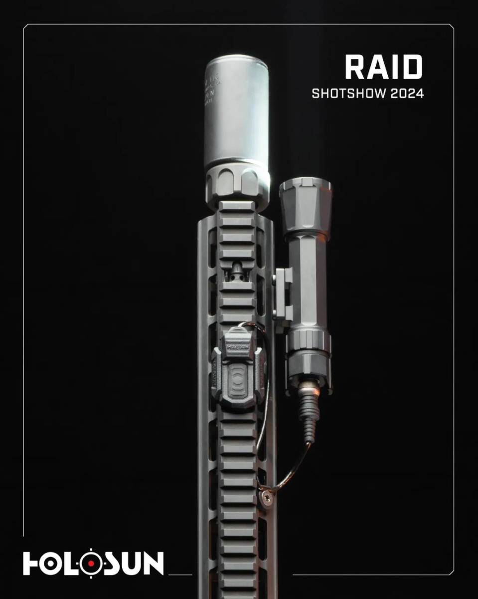 The RAID (Rifle Area Illumination Device) is an all-new, highpower, long-gun white light that brings powerful illumination and user-interface versatility. RAID features 80,000 candela and 1,000 lumens for identification of targets and greater distances. RAID is activated via the included, compact, remote switch or using the integrated tail cap button. Mounting on Picatinny rails or M-LOK is covered out of the box, and the single 18650 USB-C rechargeable battery is also included. RAID has an ultra-durable 7075 aluminum body, is IP68 dust and waterproof, and withstands 1000g of shock.