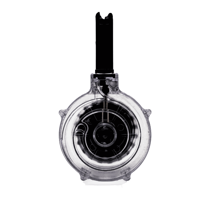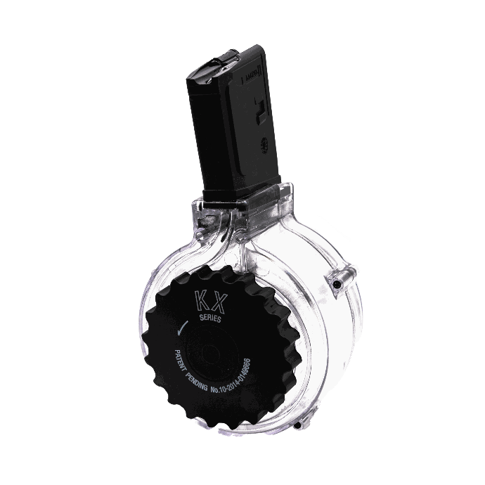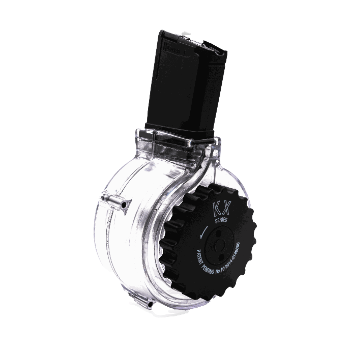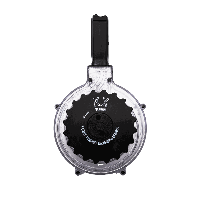 For AR-15 pattern firearms chambered in 5.56x45mm or 223 Remington. The drum feeds alternately from the left and right sides using two independent follower belts to maintain a balanced center of gravity while firing. Features steel reinforced feed lips for added durability and reliable feeding. This package includes the KCI USA 100 Round Drum, Operator's Manual, Carrying Pouch, Graphite Lubricant, and Loader. Disclaimer: Lifetime Warranty VOIDED if customer disassembles magazine! This magazine is not designed to be used with hollow point ammo.