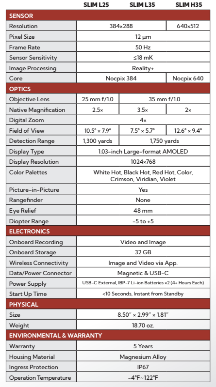 The new SLIM series from Nocpix provides the best value and features in a compact optic. Focused on versatility and ease of use, SLIM models can be used as either a handheld monocular or a weapon sight. With the included proprietary quick-detach mounting system a hunter can quickly scan and then re-attach the optic to the rifle while maintaining zero. A magnesium alloy body and quiet, soft-touch buttons provide excellent ergonomics in both handheld and weapon-mounted configurations. The included IRB-2 batteries (flat-top 18650 style cell) are easy to swap–letting you stay out longer with the ability to charge through the optic using a magnetic cable. Generous eye relief and a 1024×768 AMOLED display provide a comfortable and highly detailed viewing and hunting experience.