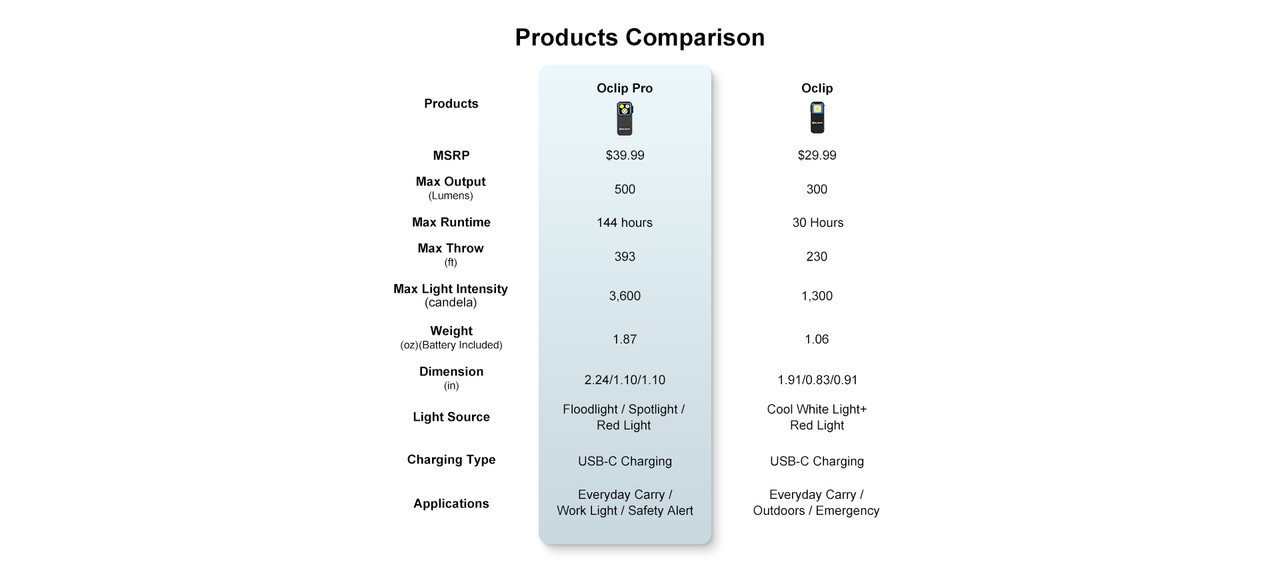 - Olight's First Clip Light with 3 Lighting Solutions: Oclip Pro comes with 500lm white flood, 120-meter range spot, and 40/4lm red light, switching by rotating the side selector.