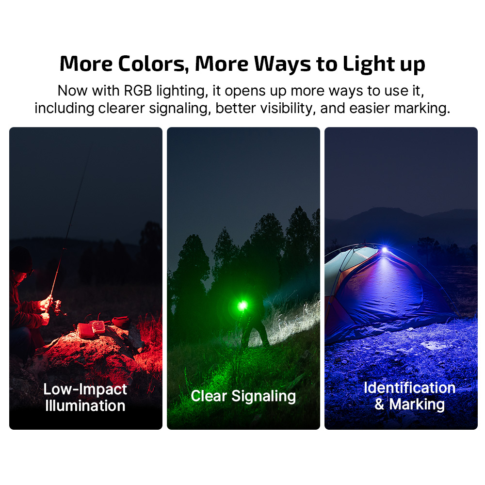 - RGB Lights: Independent red, green, and blue (steady + flashing modes) — useful for night vision preservation (red), signaling/emergencies, location marking, map reading (green), visual identification, or even creative/expressive lighting.