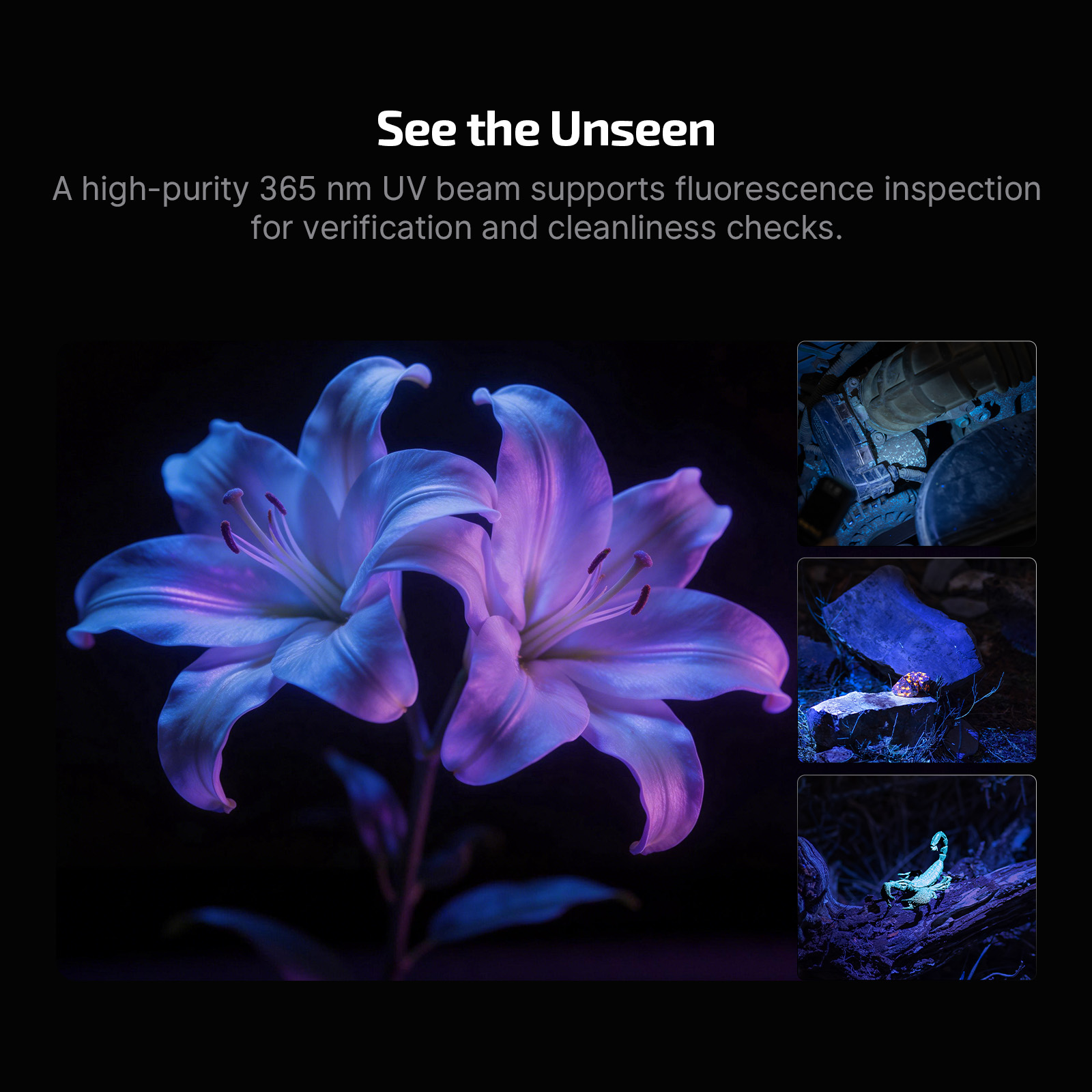 - UV Light: Pure 365 nm (high-purity, ~800 mW high / 300 mW low) — excellent for fluorescence inspection, counterfeit detection, cleanliness checks, leak detection, or pet stains.