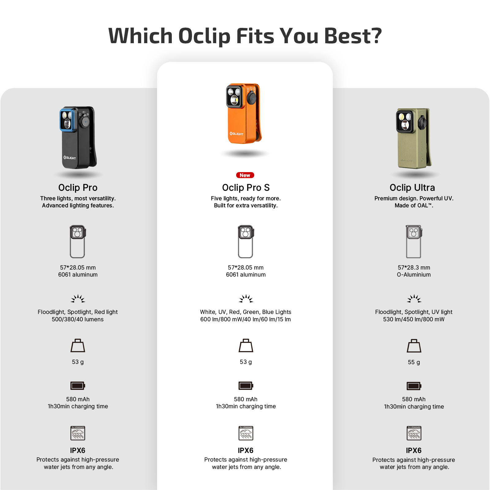 The Olight Oclip Pro S (model OCLIPPROSOG for the orange version) is a compact, multifunctional EDC clip-on flashlight released in early 2026. It serves as a highly versatile everyday carry light with a 5-in-1 lighting system in a tiny package.