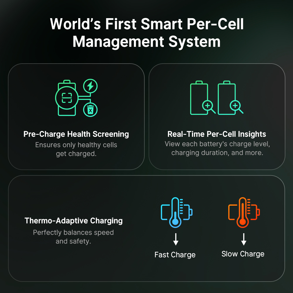 - Auto-Detect, Charge & Sort: Leading-edge per-cell management system checks each battery before charging. Only healthy batteries charge, while incompatible or unhealthy cells are automatically removed. Saves time and prevents mix-ups.