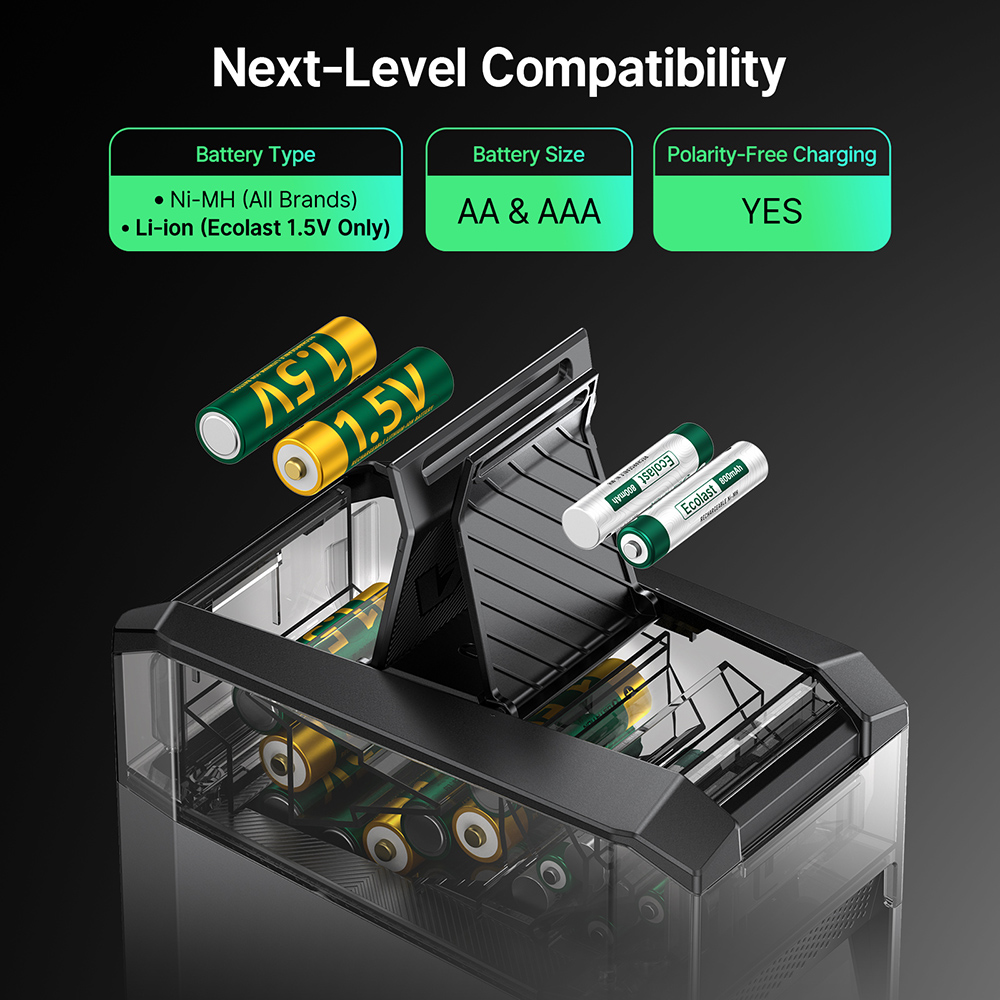 - Broad Compatibility, Polarity-Free: Supports any brand of AA and AAA Ni-MH batteries, plus our Ecolast 1.5V AA rechargeable Li-ion batteries. Drop cells in any direction—no (+)/(-) alignment needed.