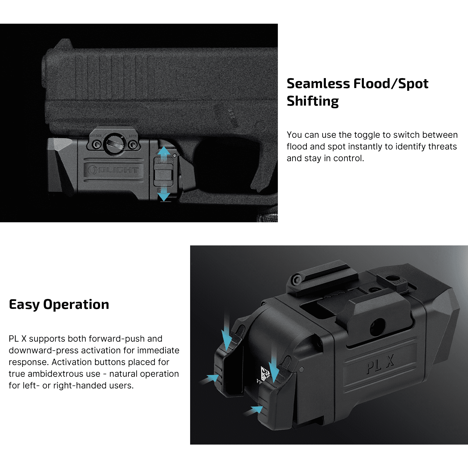 The Olight PL-X is a new, dual-beam tactical weapon light. It is designed for versatility, allowing users to switch between a wide floodlight and a focused spotlight within a single compact unit.