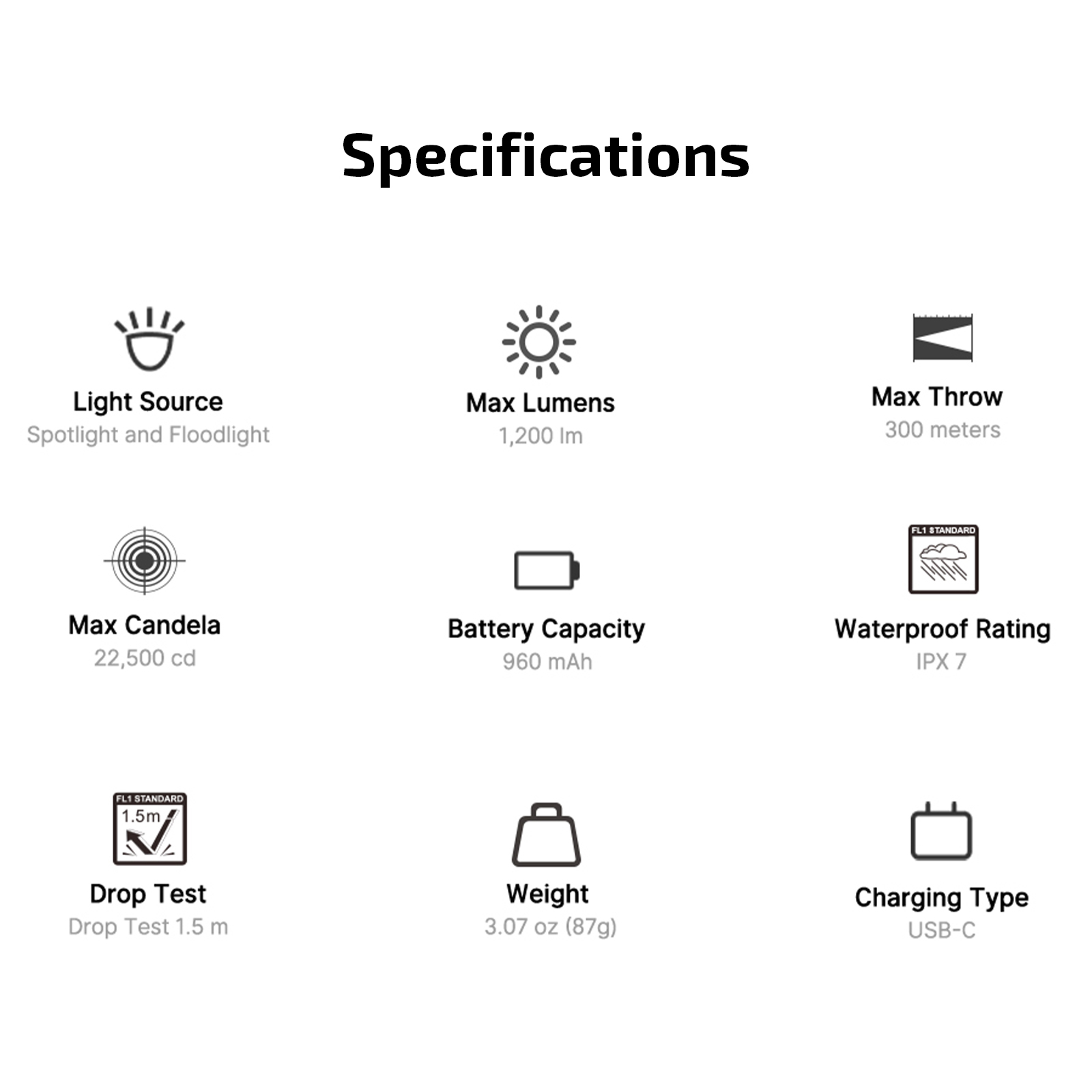 - Innovative Floodlight and Spotlight: Switch seamlessly between two exclusive, independent beams, a powerful 1,200 lumen wide floodlight for area illumination, or a focused 22,500 candela spotlight that throws up to 300 meters.