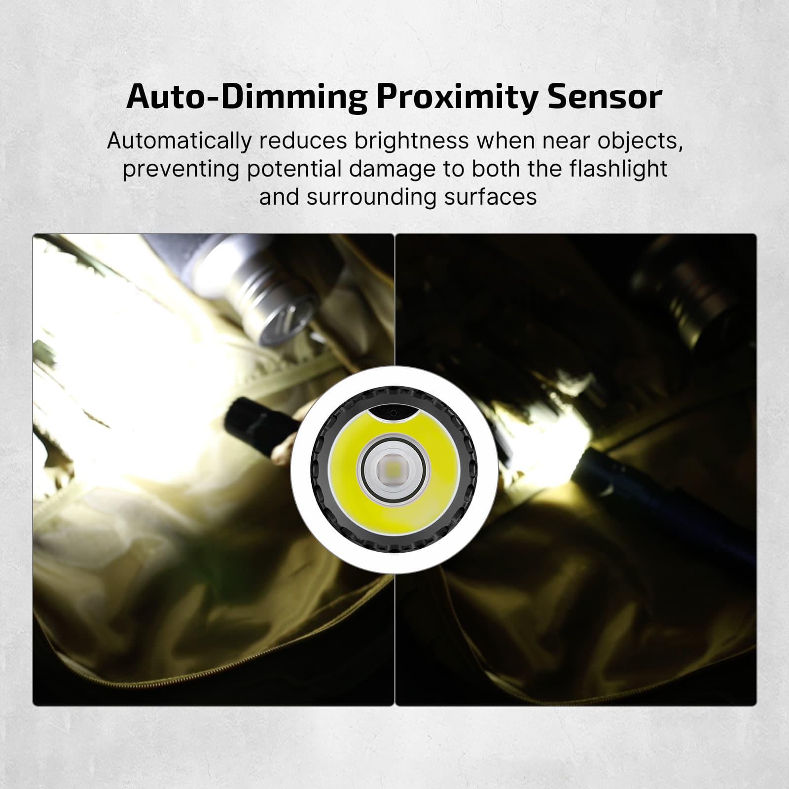 - Feels Right in Hand – Real Tactical Control: It features an oversized side switch that’s easy to access—even with gloves—and a knurled tail switch for a secure grip and smooth activation. A built-in smart proximity sensor dims the beam when objects are near.