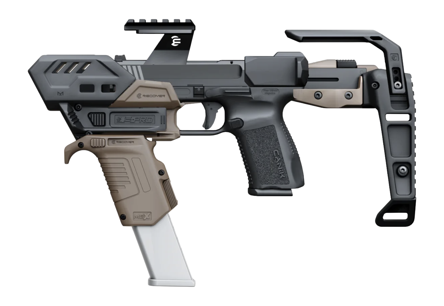 The Recover Tactical SPRO-CBGB-02 is the Tan (FDE) version of the S-PRO MG Full Kit specifically configured for Canik pistols. It is part of Recover Tactical's next-generation modular "S-PRO" line, which features a metal frame and a spring-loaded stabilizer that can be converted into a stock.