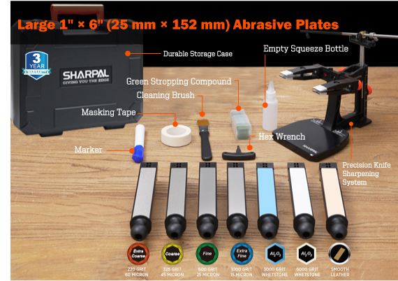 - Complete Sharpening Kit – 7 Abrasive Plates (1″ x 6″) from edge repair to mirror polish