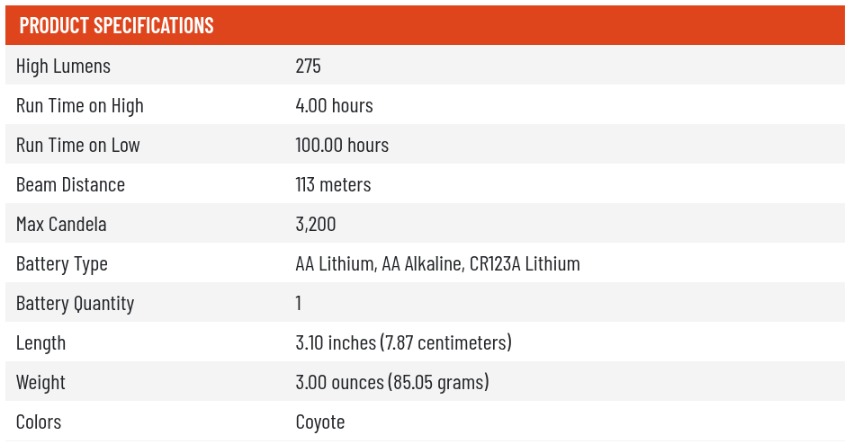 Sidewinder Compact III (SKU: 14213) - User Configurable Model - Includes (1) AA alkaline battery and (1) CR123A lithium battery - Coyote