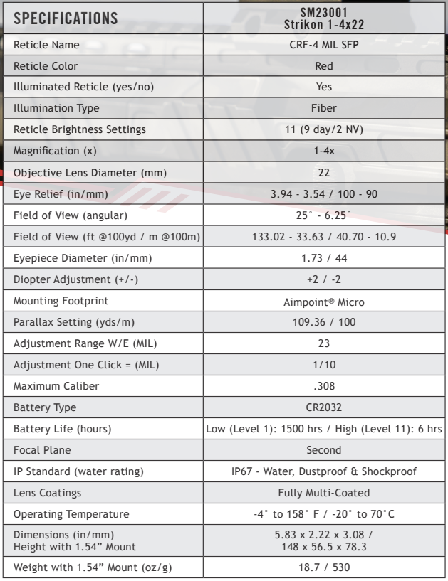 Featuring a second focal plane CRF-4 MIL reticle illuminated by a durable fiber-wire system, the Strikon VMP offers variable brightness settings across 11 levels, including 2 optimized for night vision users. With a true 1x magnification for close-quarters speed and 4x magnification for mid-range accuracy, this optic is ready for any dynamic shooting scenario.