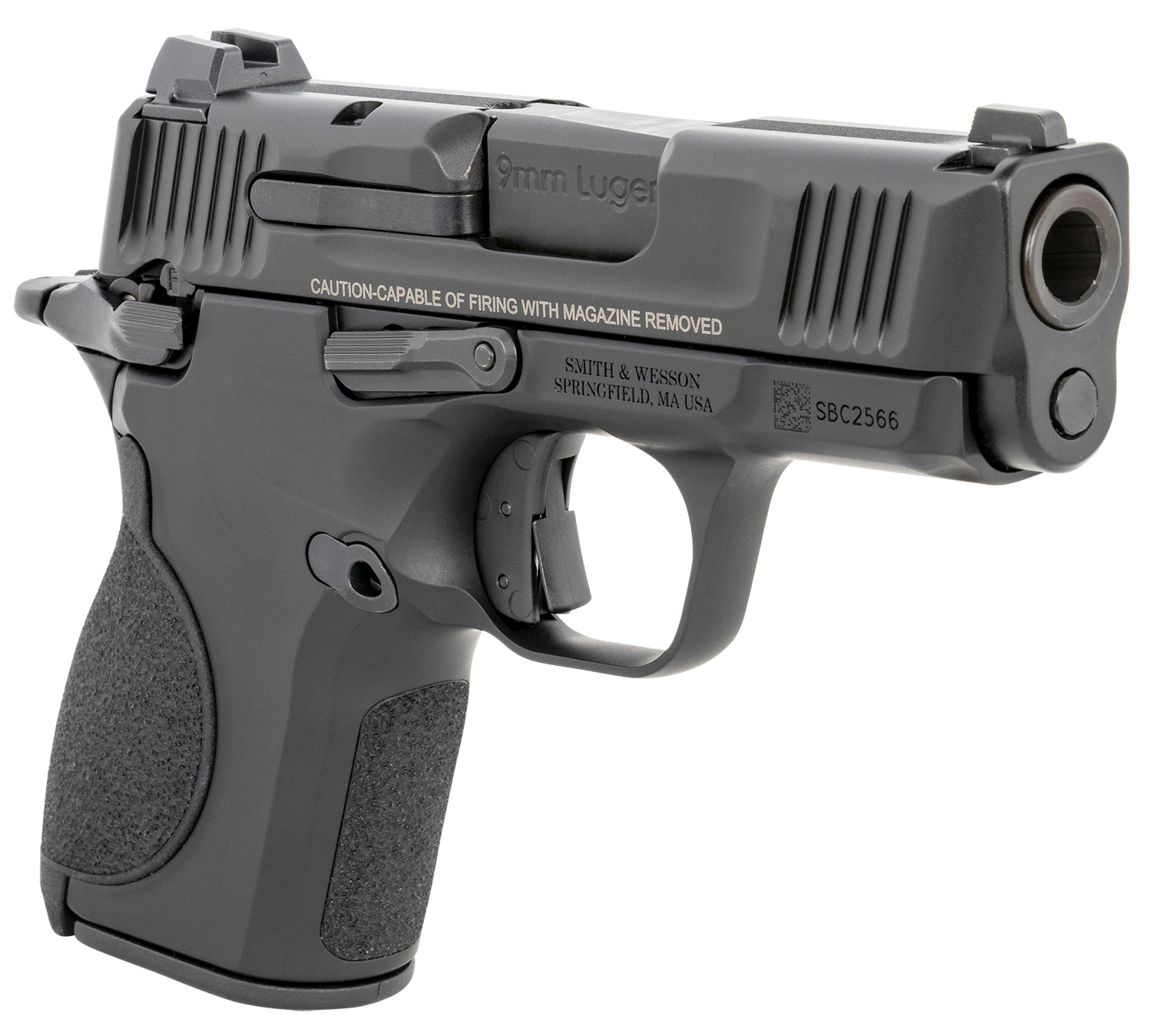 S&W's hammer fired all metal micro-compact pistol chambered in 9MM has a 3.1in barrel, is .95 wide, has a flat face trigger with integrated safety, metal white dot sights, glare reducing slide serrations, ambidextrous manual thumb safety, enhanced grip texture with two interchangeable backstraps and has a 10rd and 12rd magazine capacity!