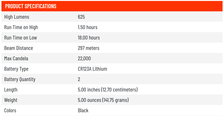 - High: 625 lumens; 297m beam; runs 2 hours; 22,000 candela