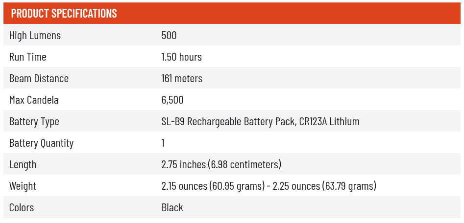 - SL-B9®: 500 lumens; 6,500 candela; 161m beam distance; runs 1 hour