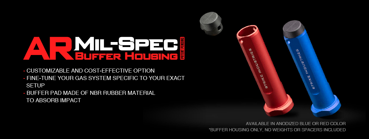 The Strike Industries AR Mil-Spec Buffer Housing gives the user a cost-effective means of customization while retaining functionality. The AR-15 buffer is often an overlooked part of the gas system that is needed to properly fine-tune your specific setup. This buffer housing is machined from 6061-T6 aluminum and designed to fit Mil-Spec standard or carbine length receiver extensions/buffer tubes while also providing a level of customization.