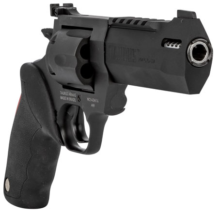 The Taurus Raging Hunter is a 44 Magnum, 6-shot revolver. Its striking blue finish is enough to grab the attention of any big-bore aficionado, but the optics-ready Picatinny rail and angular barrel design will seal the deal. The unique barrel system incorporates a steel sleeve that is inserted into an aluminum housing that cuts down on the overall weight, making this a well-balanced hunting sidearm. The exclusive cushioned insert grips on the Raging Series large frame revolvers makes shooting them comfortable and controllable. Also aiding in recoil management is the unique placement of the factory-tuned porting and gas expansion chamber that is designed to disperse gases directionally-reducing muzzle lift and delivering quicker target acquisition. This built-to-last revolver is a fun and effective alternative for short to medium range hunting scenarios.