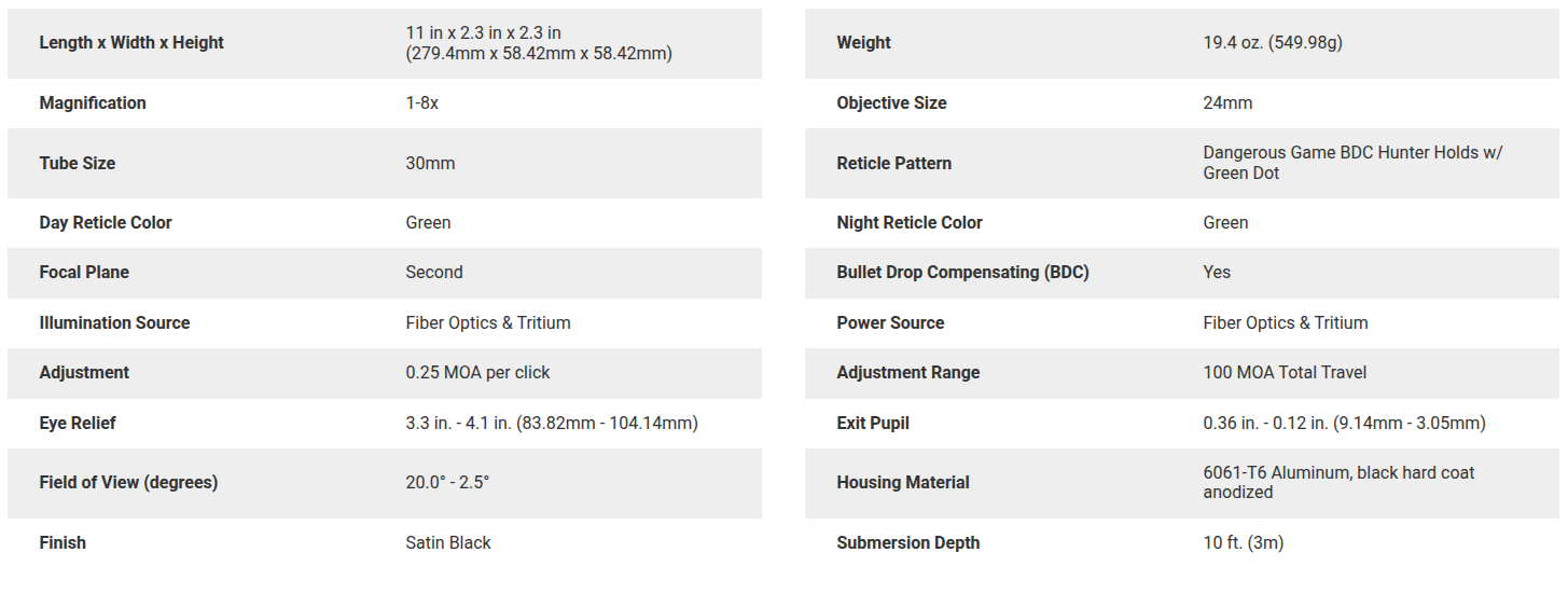 The Trijicon AccuPoint® 1-8x24 riflescope is a favorite among hunters, offering true 1x magnification with the flexibility to reach out to 8x for longer range engagements. A battery-free illuminated reticle, powered by tritium and fiber optics, allows for fast target acquisition, even in low light.