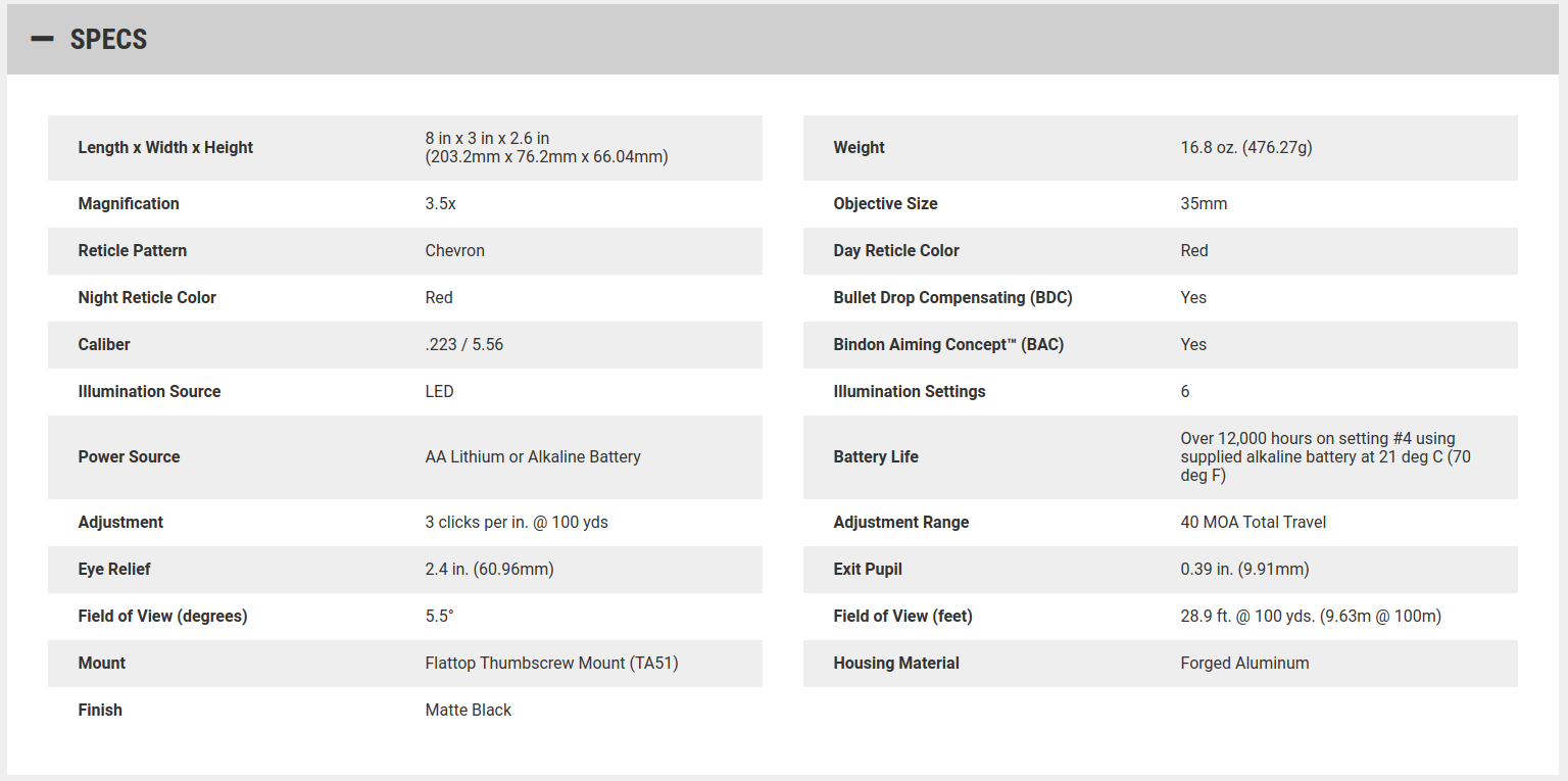From the legendary ACOG® family of products, the LED ACOG is the first to offer user-selectable brightness controls. Users can select from six adjustable brightness levels with an "off" between each setting, allowing the operator to determine how much to illuminate the reticle - even in transitional lighting. Powered by a single AA battery, the LED ACOG can run for over 12,000 continuous hours (on setting #4). Like all ACOG models, it is forged from rugged 7075-T6 aircraft-aluminum, resulting in a nearly indestructible sighting system and electronics that offer outstanding reliability. Users can select multiple bullet drop compensating and ranging reticle options. Fully night vision device compatible, the Trijicon 3.5x35 LED ACOG is also compatible with most other 3.5x35 ACOG accessories available.