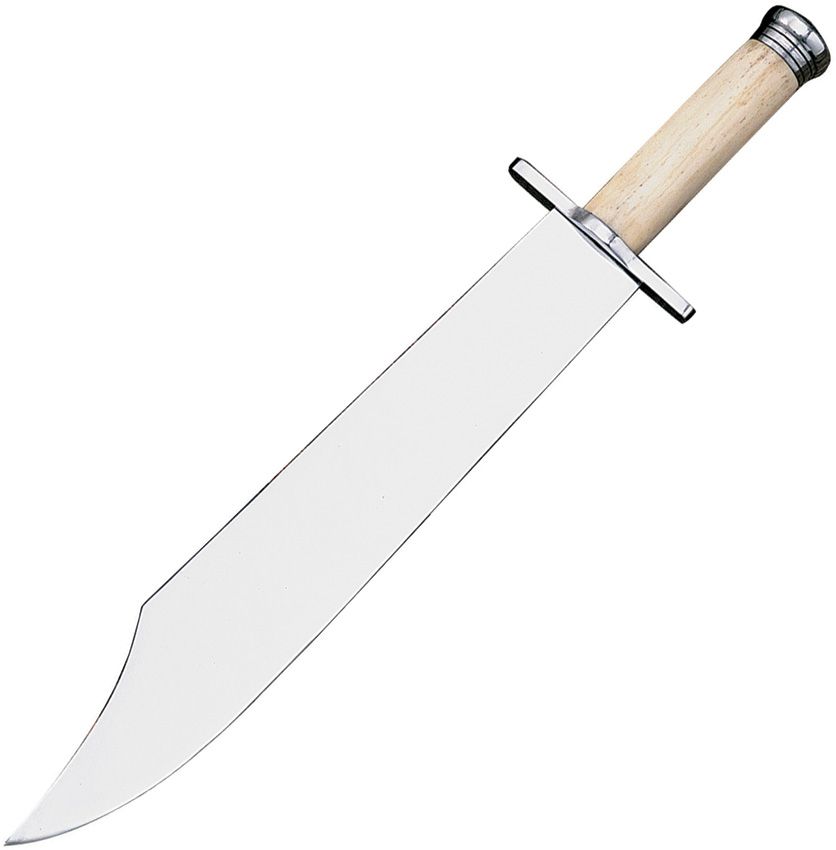 - Blade: 13.5" (34.29 cm) clip-point Bowie blade with a satin finish. Made from 1065 high-carbon steel (or similar high-carbon steel) — tough, holds an edge well when properly maintained, and easy to sharpen in the field.